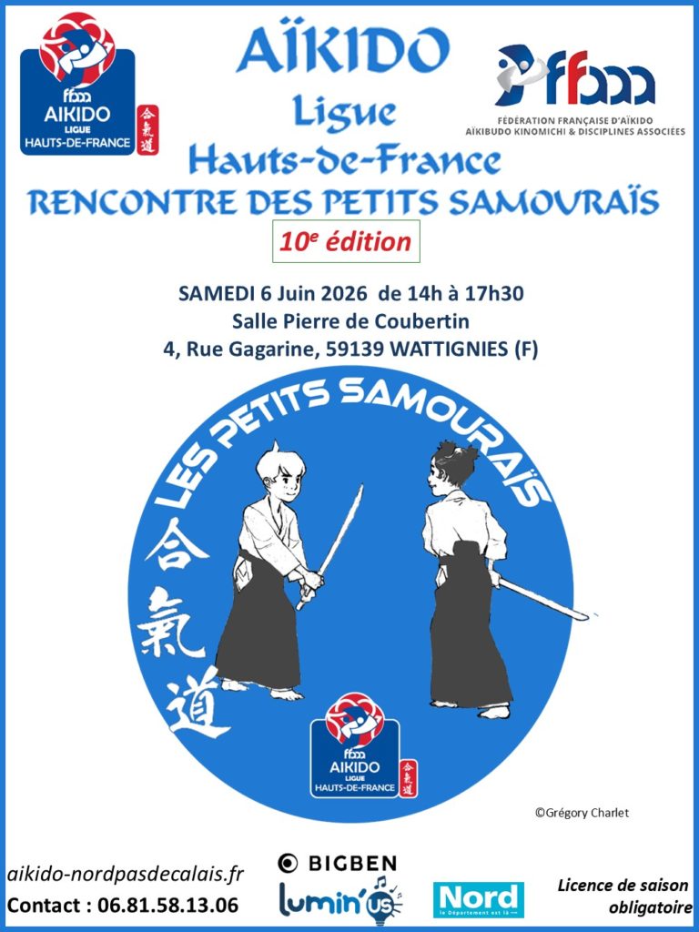 « Tous les Évènements 10e rencontre des Petits Samouraïs le 6 Juin à Wattignies 6 juin 2026 à 14 h 00 min - 17 h 30 min « Stage Laurent DAMBRINE (5e Dan) à Douai le 17 mai Assemblée générale à Villeneuve d’Ascq le 20 juin » Télécharger et imprimer l’affiche : 2026_06_06_affiche_rencontre_petits_samourais + Google Agenda+ Exporter vers iCal Détails Date : 6 juin 2026 Heure : 14 h 00 min - 17 h 30 min Catégorie d’Évènement: Petits Samouraïs Organisateur Ligue Hauts-de-France Lieu Wattignies (59) Dojo – Aïkido club Wattignies 4 rue Gagarine Wattignies, 59139 France + Google Map Téléphone : 06 64 98 37 78