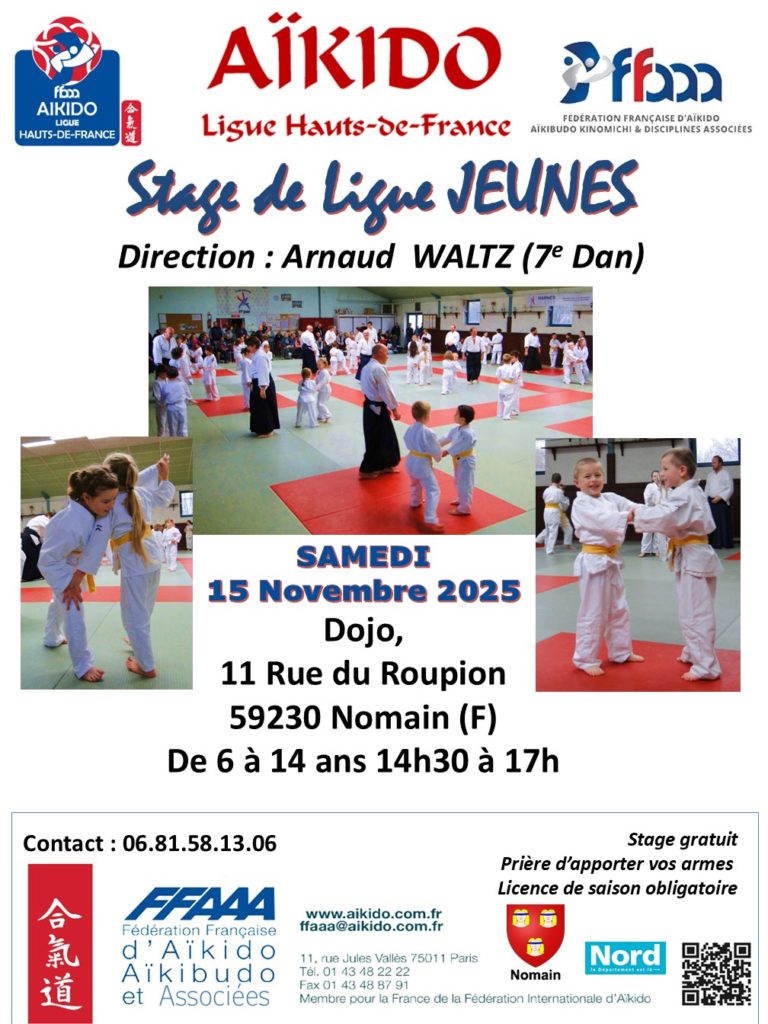 « Tous les Évènements Stage Jeunes de 6 à 14 ans le 15 novembre de 14h30 à 17h à Nomain 15 novembre à 14 h 30 min - 17 h 00 min « Rencontre enseignants Jeunes dirigée par Arnaud WALTZ (7e Dan) le 15 novembre de 9h à 12 à Nomain stage Laurent DAMBRINE (5e Dan) le 16 novembre à Douai » Télécharger et imprimer l’affiche : 2025_11_15_stage_juniors_Waltz_Nomain + Google Agenda+ Exporter vers iCal Détails Date : 15 novembre Heure : 14 h 30 min - 17 h 00 min Catégorie d’Évènement: Stages enfant Organisateur Ligue Hauts-de-France Lieu Nomain (59) Dojo de Nomain 11, rue du Roupion Nomain, Hauts-de-France 59230 France + Google Map Téléphone : 06.13.03.20.85